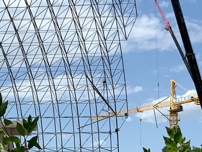 (1)本工程網架采用“山墻起步+錐體高空散裝法”進行安裝,即先安裝1軸山墻網架(含相鄰跨網架)作為整個網架的起步網架,然后從起步網架開始依次往17軸方向對網架進行高空散裝,***后安裝17軸山墻網架,***終安裝完成整個網架。